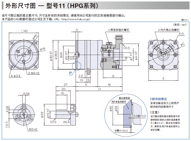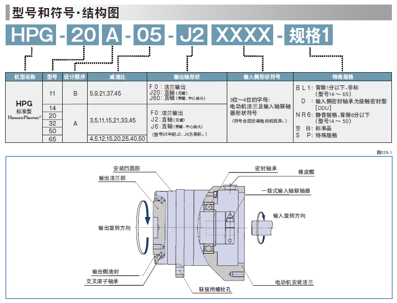 HPG行星齒輪減速機高精度行星齒輪減速機,可簡單的安裝到各公司的伺服電機上。 諧波發生器:橢圓形凸輪的外圈上嵌入薄型的滾珠軸承,整體呈一橢圓形狀的零件。軸承的內圈固定于凸輪之上,外圈則介由滾珠彈性變形。一般安裝在輸入軸上。 柔輪:具有薄壁杯型的金屬彈性體的零件。杯的開口部外圈刻有齒形。柔輪的底部稱為膜,通常安裝到輸出軸上。 剛輪:剛性環狀的零件。內側上刻有與柔輪同樣大小的齒形,且比柔輪多2個齒數。一般固定在外殼上。